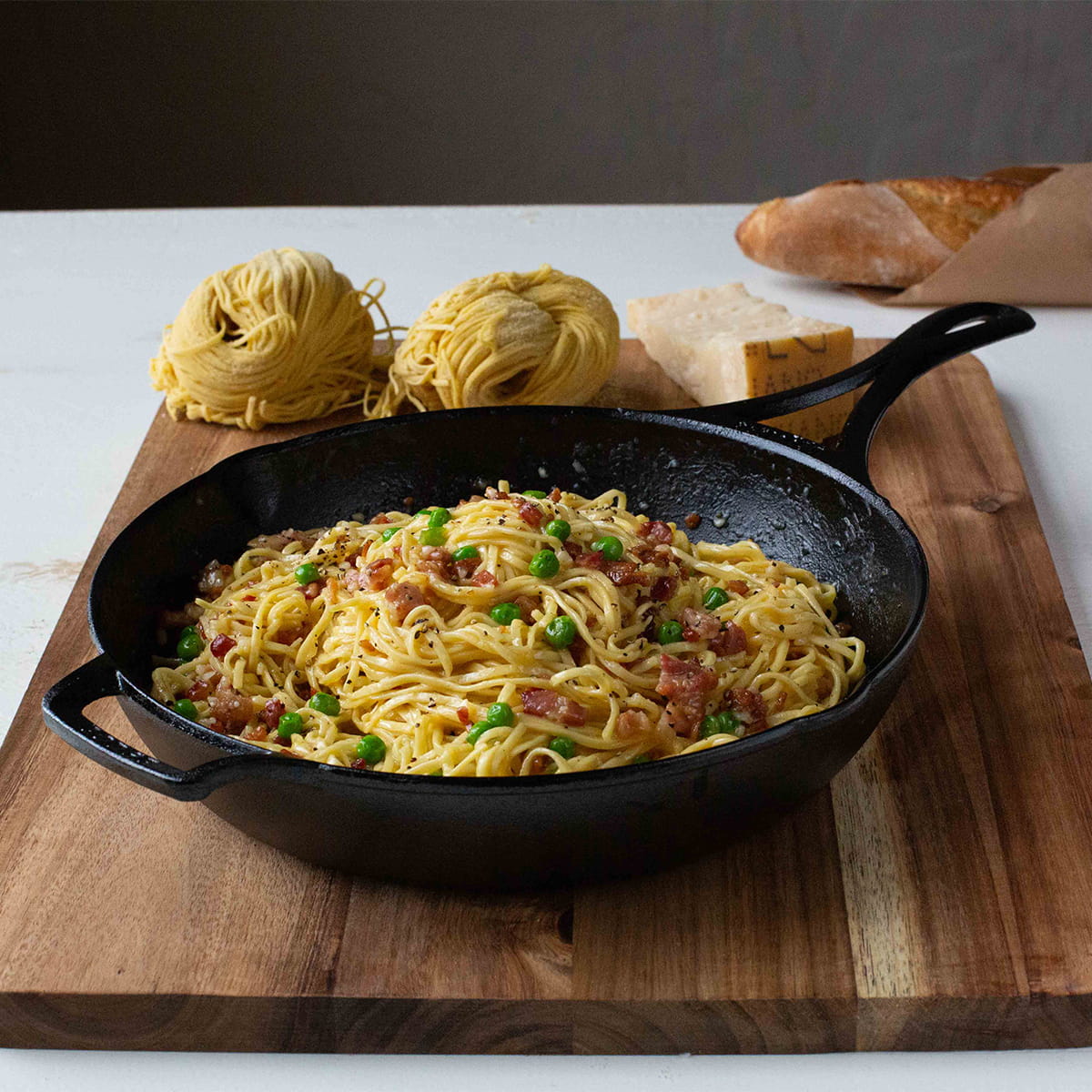 Potrójnie sezonowana patelnia z żeliwa, która jest lżejsza od innych patelni z tego materiału.